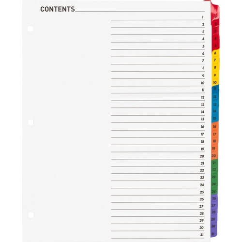 Business Source Table of Content Quick Index Dividers – Printed Tab(s) – Digit – 1-31 – 31 Tab(s)/Set – 8.5″ Divider Width x 11″ Divider Length – 3 Hole Punched – Multicolor Divider – Multicolor Mylar Tab(s) – 31 / Set