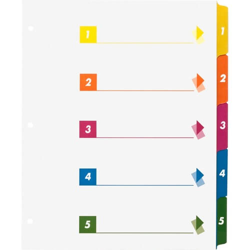 Business Source Color-coded Table of Contents/Tabs Index Dividers – Printed Tab(s) – Digit – 1-5 – 5 Tab(s)/Set – 3 Hole Punched – White Divider – Multicolor Mylar Tab(s) – 24 / Box