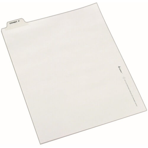 General Information Manufacturer: Avery Manufacturer Part Number: 82426 Manufacturer Website Address: http://www.avery.com Brand Name: Avery® Product Name: Side Tab Individual Legal Dividers Marketing Information: Dividers are ideal for index briefs, legal exhibits, mortgage documentation files and more. White paper stock features clear RipProof reinforced tabs. Side tabs are printed with Avery Style (Helvetica Bold type) on both sides. Binding edge is unpunched so indexes can fit any binding system. More from the Manufacturer Packaged Quantity: 1 Product Type: Index Divider Product Information Total Number of Dividers: 25 Divider Width: 8.5″ Divider Length: 11″ Divider Color: White Divider Material: Paper Sheet Standard: Letter Sheet Size: 8.50″ Width x 11″ Length Tab Position: Side Tab Title: 210 Tabs per Set: 1 Features: Unpunched Double-sided Reinforced Tab Rip Proof Miscellaneous Recycled: Yes Recycled Content: 20% Post-consumer-waste%: 20% Country of Origin: Mexico